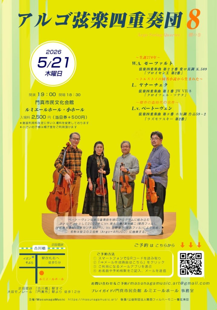 アルゴ弦楽四重奏団 8回目の演奏会を5/21(木)に開催いたします🎵